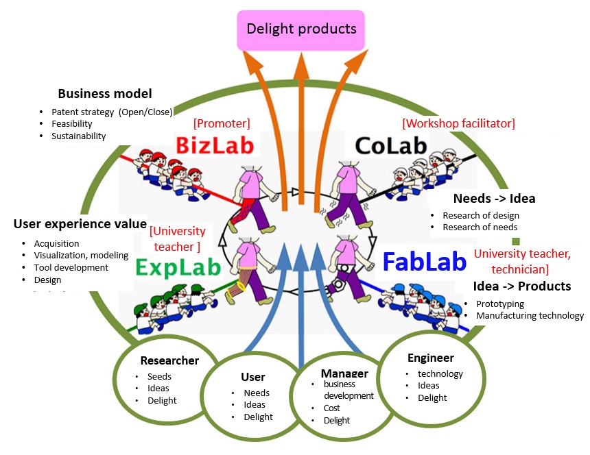 - We aim to build a cooperative creation environment and design method (Tokyo Tech Design Factory, Delight Engine) for users, managers, engineers, researchers to develop new delight products together. (Figure 1)